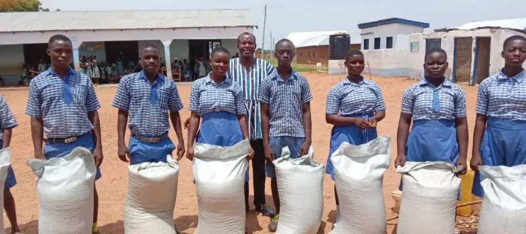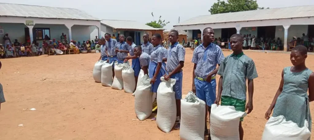In Ghana gibt es anstatt von Jahreszeiten Trocken- und Regenzeiten. Das bedeutet, das auch zweimal im Jahr geerntet werden kann. In den letzten Jahren ist es deutlich trockener geworden durch weniger Regen, so dass die Ernten schlecht waren. So hat HibeKi unsere Schülerinnen und Schüler bisher jedes Jahr mit Nahrung unterstützen müssen. Neben dem regulären Schulessen konnte dank unseren Vereinsmitgliedern ein Sack Mais pro Schülerin / Schüler angeschafft werden. Dieses wurde üblicherweise zwischen den Ernten, der sogenannten “lean season” durchgeführt.