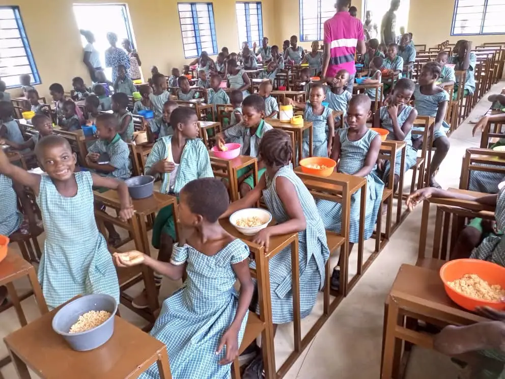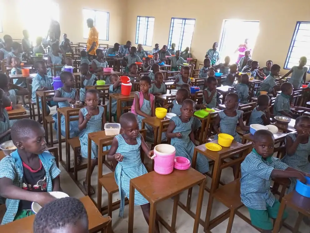 Große Freude in Nayorku: Endlich kann die Schulmahlzeit dank neuen Mobiliars gemeinsam an Tischen sitzend in der neu errichteten Kantine eingenommen werden!